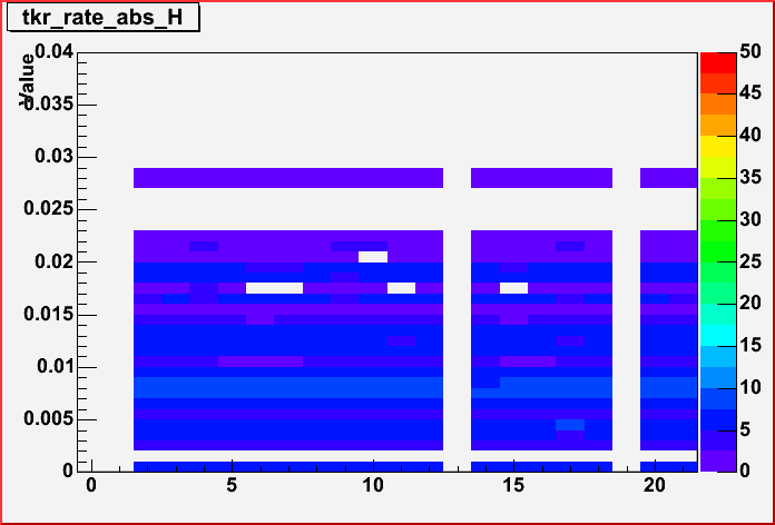 Track rate: Fraction of events with a track extrapolated into tile or ribbon Range: 0.0% - 3.0% (for horizontal muons) |