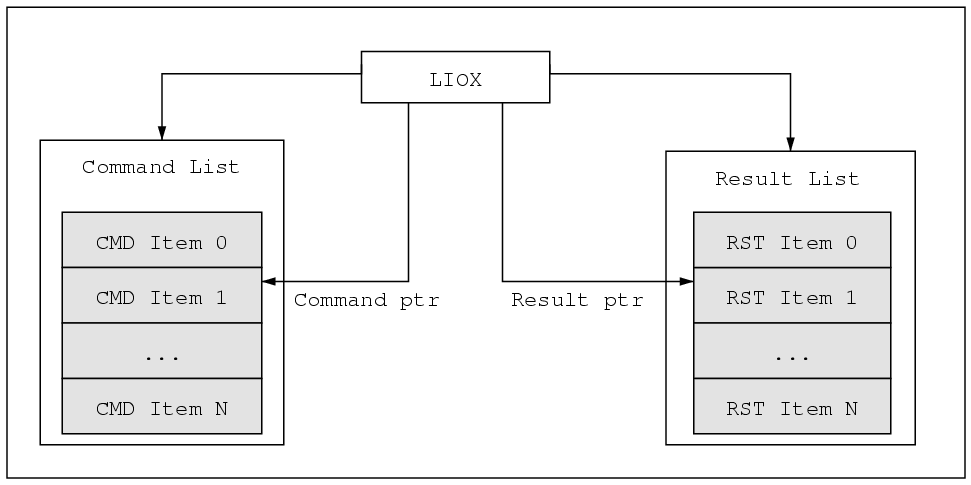 The LCBD provides a data structure for organizing the command list and the result list called the LAT I/O Transaction (LIOX). Users communicate with the LCBD via an opaque handle to a LIOX structure. A diagram showing the relationship between the command list, result list and LIOX structure is shown below in Figure 2-4.