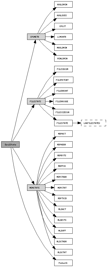 Epu2Stats (pkt) | Padus16 spares[0-2] (fld) | CPUMETR cpu (str) | | LCMCNTR lcm[0-2] (fld) | | CPUJT temp (fld) | | AVGLDSEC avgsec (fld) | | AVGLDMIN avgmin (fld) | | MINLDMIN min (fld) | | MAXLDMIN max (fld) | FILESTATS file (str) | | FILESTATE state (fld) | | FILESIZECUR cursize (fld) | | FILEPKTCNT pktcnt (fld) | | FILERRCODE errcode (fld) | | FILERRCNT errcnt (fld) | | FILEIDCOM comid (fld) | MEMSTATS mem (str) | | MLDSTAT ldstat (fld) | | MLDACT ldact (fld) | | MLDSTADR ldstart (fld) | | MLDBYTS ldbytes (fld) | | MLDOFF ldoffset (fld) | | MDPSTAT dmpstat (fld) | | MDPACT dmpact (fld) | | MDPSTADR dmpstart (fld) | | MDPBYTS dmpbytes (fld) | | MDPADDR dmpaddr (fld) | | MDPFCD dmpfcode (fld) | | MDPTXID dmptid (fld)