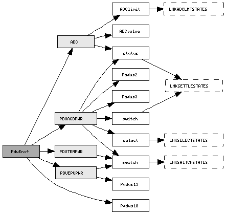 PduEnv4 (pkt) | Padus16 rsv (fld) ... spare0[0-1] (fld) | PDUTEMPWR tempwr (bf) | | switch temf (0) ... tem0 (15) | PDUEPUPWR epupwr (bf) | | Padus13 spare0 (0-12) | | switch epu2pwr (13) ... epu0pwr (15) | PDUACDPWR acdpwr (bf) | | Padus3 spare0 (0-2) | | status temread (3) | | Padus3 spare1 (4-6) | | status epuread (7) | | Padus3 spare2 (8-10) | | switch acdread (11) | | Padus2 spare3 (12-13) | | select supply (14) | | switch acd (15) | ADC temvolt[0-15] (bf) | | ADClimit limit (0-2) | | status status (3) | | ADCvalue value (4-15) | ADC temtemp[0-15] (same bf) | ADC epuvolt[0-2] (same bf) | ADC eputemp[0-2] (same bf) | Padus16 spare1[0-6] (fld)