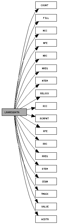 LRAREGDATA (pkt) | SEQN seqn (fld) | COUNT count (fld) | RCMPNT cmpnt (fld) | RBLOCK block (fld) | RTEM tem (fld) | RCC cc (fld) | RRC rc (fld) | RFE fe (fld) | RREG reg (fld) | FILL fill (fld) | TMASK tmask (fld) | NTEM ntem (fld) | NCC ncc (fld) | NRC nrc (fld) | NFE nfe (fld) | NREG nreg (fld) | WIDTH width (fld) | VALUE value (fld)