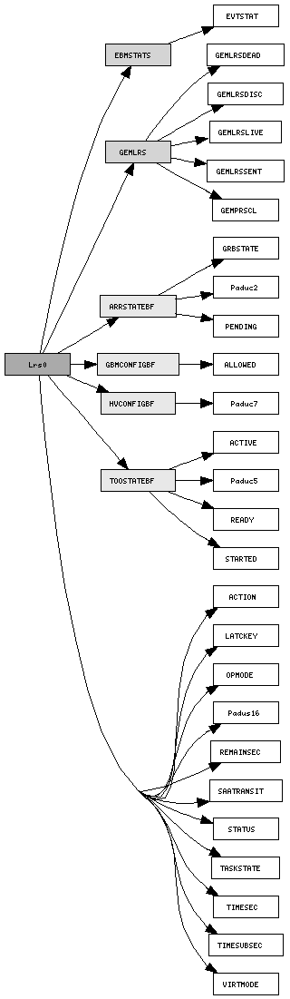 Lrs0 (pkt) | Padus16 spares[0-2] (fld) | TIMESEC gemsec (fld) | TIMESUBSEC gemsub (fld) | GEMLRS gemlrs (str) | | GEMLRSLIVE live (fld) | | GEMPRSCL presc (fld) | | GEMLRSDISC disc (fld) | | GEMLRSSENT sent (fld) | | GEMLRSDEAD dead (fld) | TIMESEC ebmsec (fld) | TIMESUBSEC ebmsub (fld) | EBMSTATS ebmstat (str) | | EVTSTAT evts[0-12] (fld) | ACTION action (fld) | STATUS status (fld) | OPMODE op_mode (fld) | VIRTMODE virt_mode (fld) | SAATRANSIT saa_transit (fld) | TASKSTATE lci_state (fld) ... lpa_state (fld) | TOOSTATEBF too_state (bf) | | Paduc5 pad (0-4) | | STARTED started (5) | | ACTIVE active (6) | | READY ready (7) | ARRSTATEBF arr_state (bf) | | Paduc2 pad (0-1) | | PENDING rep_req_pending (2) | | GRBSTATE grb_state (3-5) | | ACTIVE active (6) | | READY ready (7) | REMAINSEC too_remain_sec (fld) ... arr_remain_sec (fld) | GBMCONFIGBF gbm_config (bf) | | Paduc5 pad (0-4) | | ALLOWED pri_int_allowed (5) ... rep_req_allowed (7) | HVCONFIGBF hv_config (bf) | | Paduc7 pad (0-6) | | ALLOWED hv_allowed (7) | Padus16 pad1 (fld) | REMAINSEC gbm_int_dis_remain_sec (fld) | LATCKEY latc_key (fld)