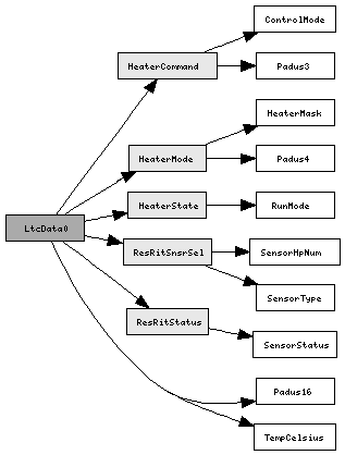 LtcData0 (pkt) | Padus16 spares[0-2] (fld) | ResRitSnsrSel snsrSel[0-11] (bf) | | SensorHpNum resHpNum (0-3) | | SensorType resType (4-7) | | SensorHpNum ritHpNum (8-11) | | SensorType ritType (12-15) | ResRitStatus snsrStatus[0-11] (bf) | | SensorStatus ritStatus (0-3) ... resStatus (4-7) | HeaterMode actvHp (bf) | | Padus4 pad4 (0-3) | | HeaterMask htr11 (4) ... htr0 (15) | HeaterCommand htrCmd (bf) | | ControlMode cntlMode (0) | | Padus3 pad3 (1-3) | | HeaterMask htr11 (4) ... htr0 (15) | HeaterState htrReg (bf) | | RunMode runMode (0) | | Padus3 pad3 (1-3) | | HeaterMask htr11 (4) ... htr0 (15) | TempCelsius temps[0-23] (fld) | Padus16 spare[0-2] (fld)