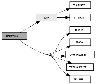 LMEMSYMVAL (pkt) | TIDBF idents (bf) | | TLATUNIT latUnit (0-3) | | TTRANID tranID (4-15) | TSYMVAL symValue (fld) | TSYMNAMESIZE nameSize (fld) | TPAD8 pad8 (fld) | TPAD16 pad16 (fld) | TSYMNAMECHAR name[0-47] (fld)