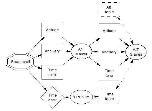 DescriptionThe spacecraft reports its orientation (i.e., attitude) and time on a regular basis. These tasks record the information, for use by other tasks. The slave tasks are responsible for distributing the data. The master task receives seven messages per second from the spacecraft: 5 attitude, 1 time-tone, 1 ancillary (containing orbit information and status info). The master task redistributes these messages to slave tasks on all CPUs. The slave tasks use these messages to build time and attitude tables for interrogation by other tasks/functions. Attitude tables can be interpolated to give spacecraft attitude at a requested time. Time tone messages, combined with time hacks (also distributed to all CPUs) provide wall clock time throughout the system, accurate to ~200 nanoseconds.
