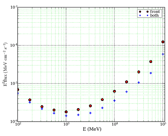 Finally, experiments are often compared using an integral sensitivity plot (5-sigma sensitivity for E>E0), assuming a 1/E2 spectrum source at high latitude. We show here an update for the GLAST LAT: