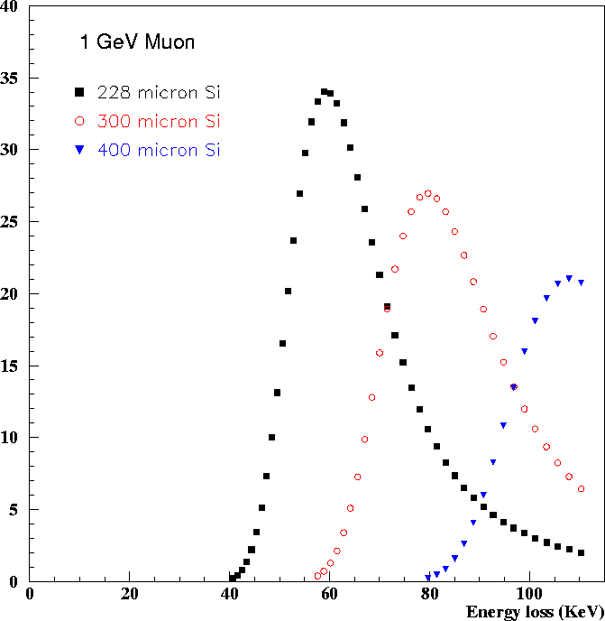 The term 'MIP' refers to 400mm silicon, so that the 1/2 MIP test at single hit level is relevant as seen in both cases above, but it is the worst single hit case (excluding wafer edge effects). To translate ionization path length into pulse heights, can look at ionization straggling calculations a la Hans Bichsel (See Mod. Rev. Phys. 60, p663 (1998)):