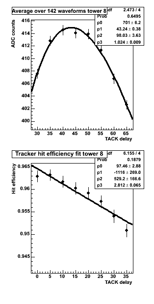 Standard TKR jitter test Upper band=0.5 MIP Qinj giving later trigger time and more jitter. Lower band=5 MIP Qinj giving earlier trigger time and less jitter. |
